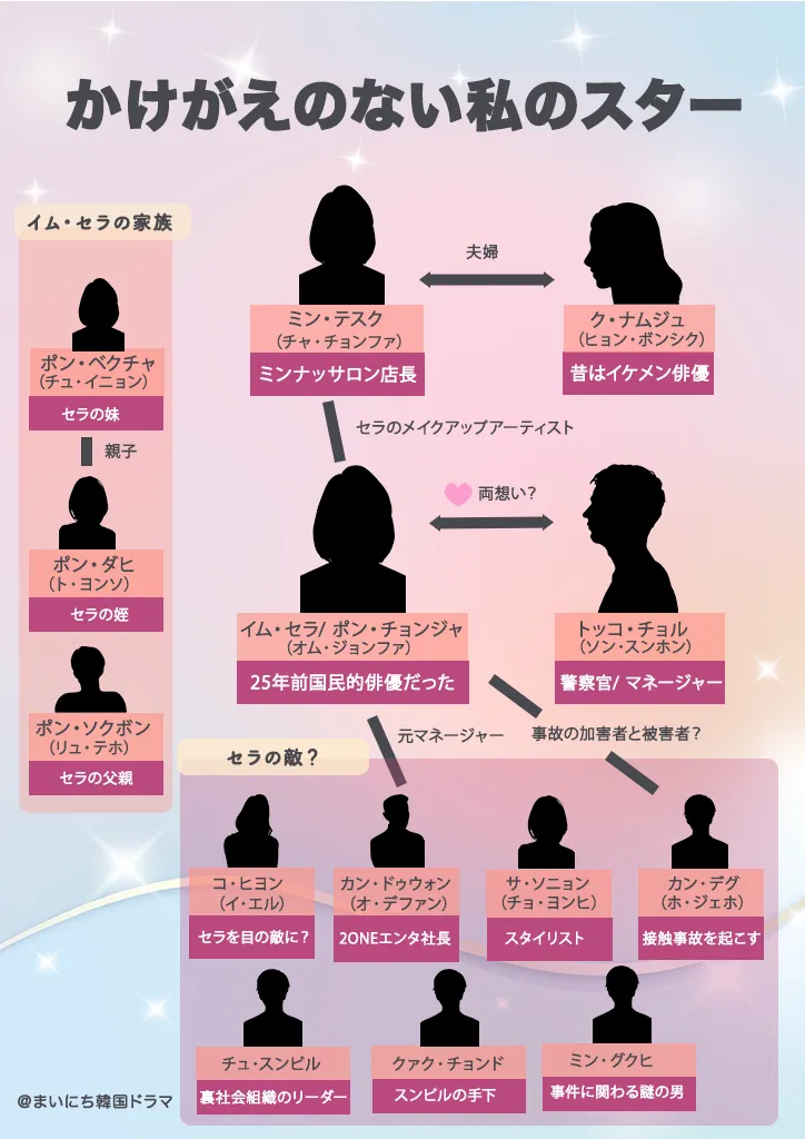 韓国ドラマ『かけがえのない私のスター』の相関図を以下にまとめました。見づらい場合は画像をタップすると拡大します。