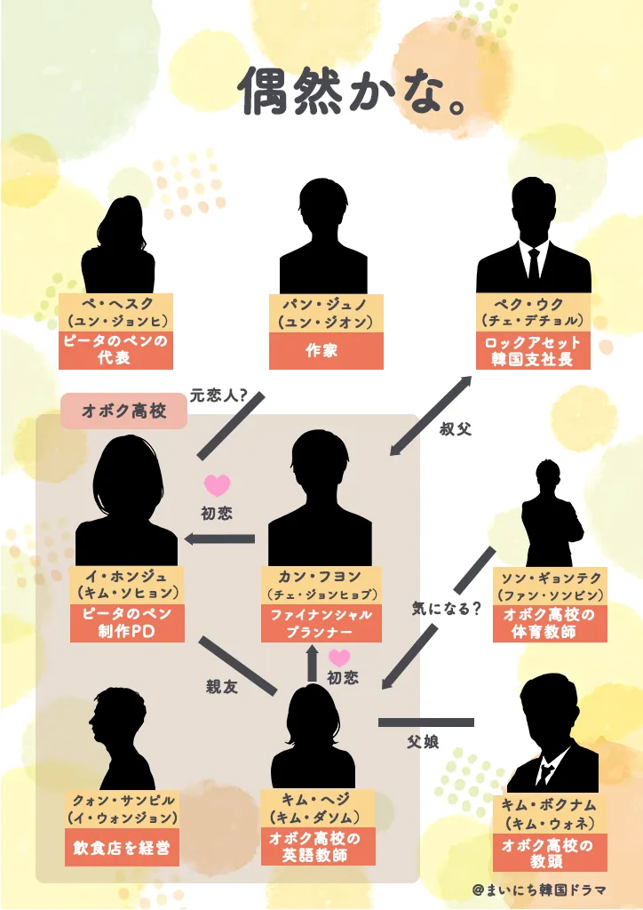 韓国ドラマ『偶然かな。』の相関図を以下にまとめました。見づらい場合はタップしてご覧ください。