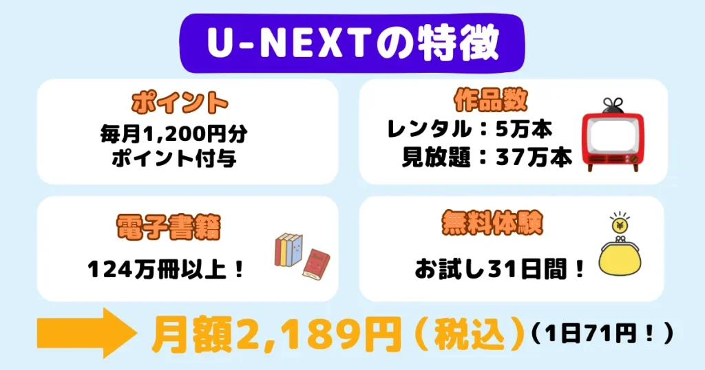 迷ってる方は作品数が多いU-NEXTを選んでおけば間違いなしです。U-NEXTの特徴やメリット・デメリットを紹介します。
